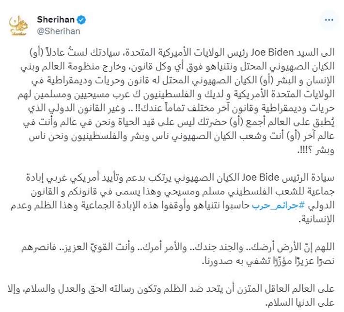 أضافت سيادة الرئيس Joe Bide الكيان الصهيوني يرتكب بدعم وتأييد أمريكي غربي إبادة جماعية للشعب الفلسطيني مسلم ومسيحيوهذا يسمى في قانونكم والقانون الدولي جرائم حرب حاسبوا نتنياهو وأوقفوا هذه الإبادة الجماعية وهذا الظلم وعدم الإنسانية. اللهم إنالأرض أرضك.. والجند جندك.. والأمر أمرك.. وأنت القوي العزيز.. فانصرهم نصرا عزيزا مؤزرا تشفي به صدورنا. على العالم العاقل المتزنأن يتحد ضد الظلم وتكون رسالته الحق والعدل والسلام، وإلا على الدنيا السلام